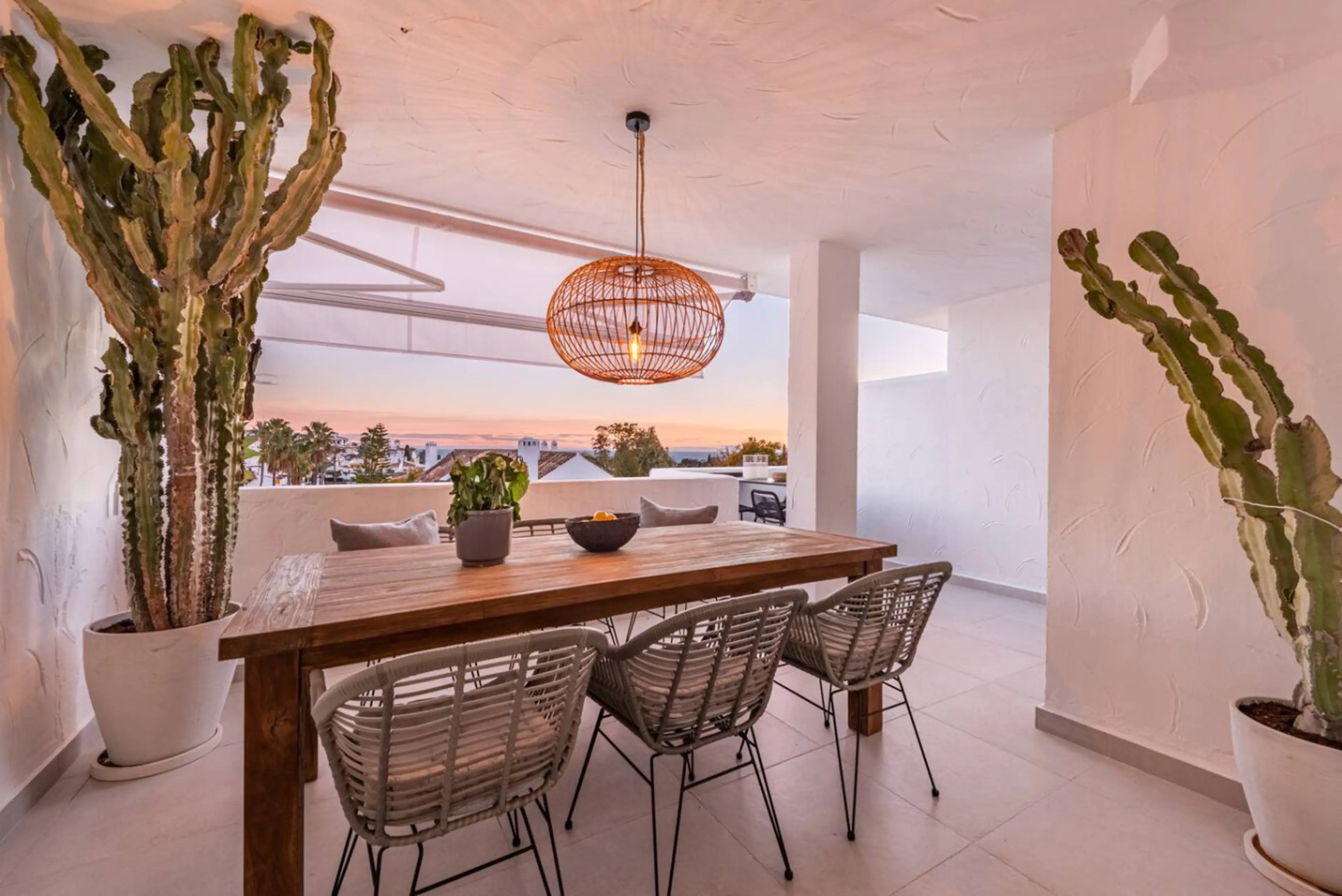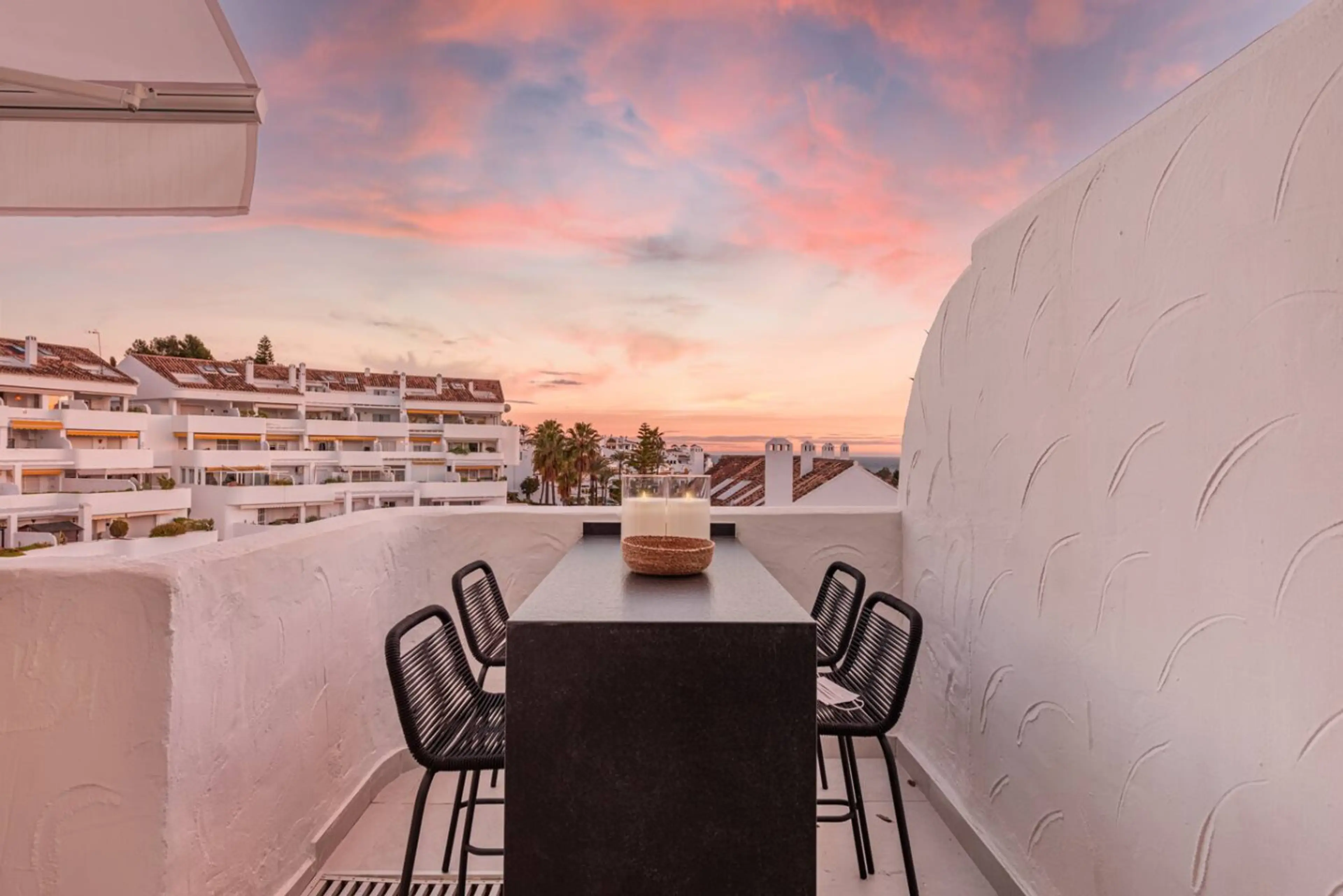 Ocaso Penthouse is a beautifully renovated three bedroom, three bathroom duplex set in the heart of Nueva Andalucía, offering a refined blend of space, style, and exceptional coastal views. South facing and filled with natural light, the residence enjoys expansive terraces overlooking the Mediterran...